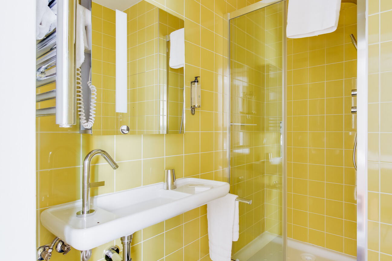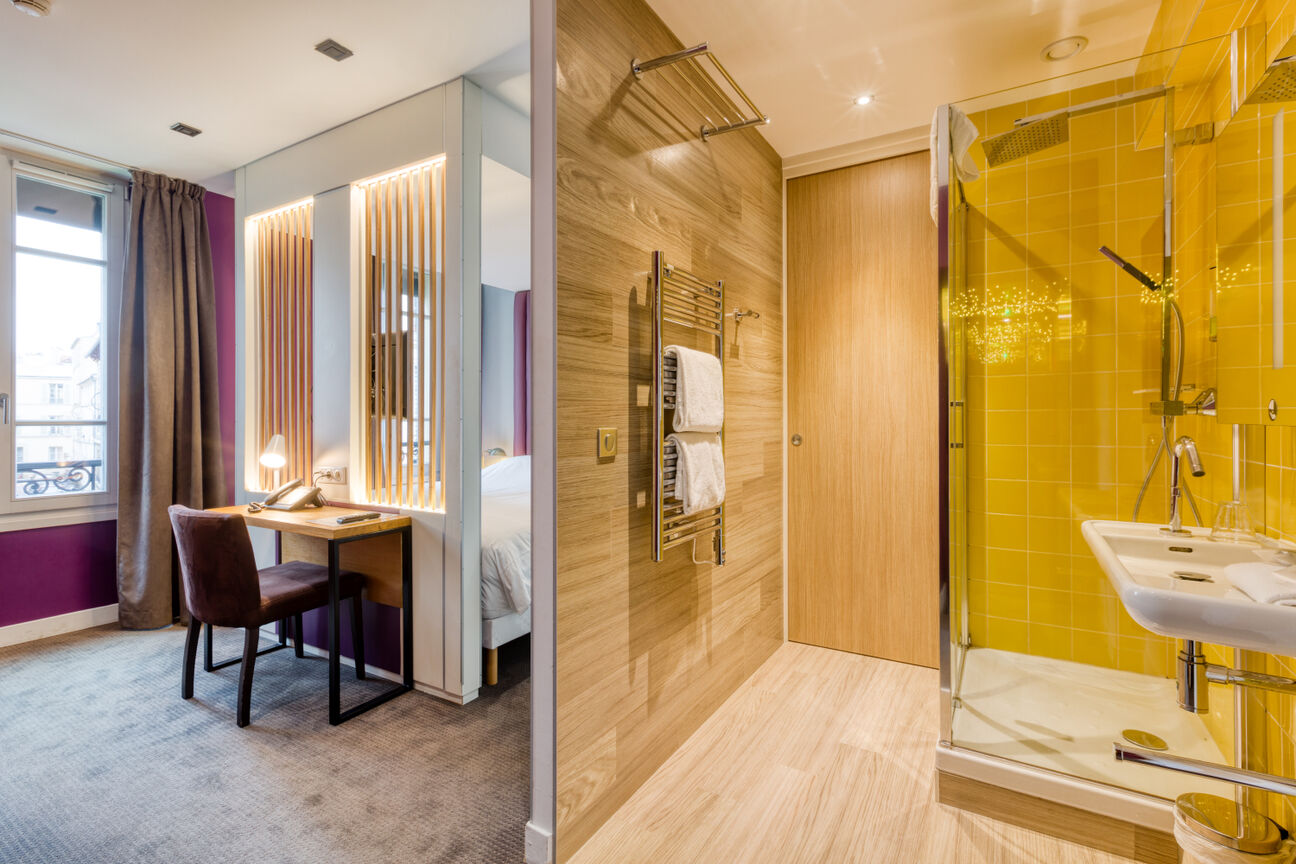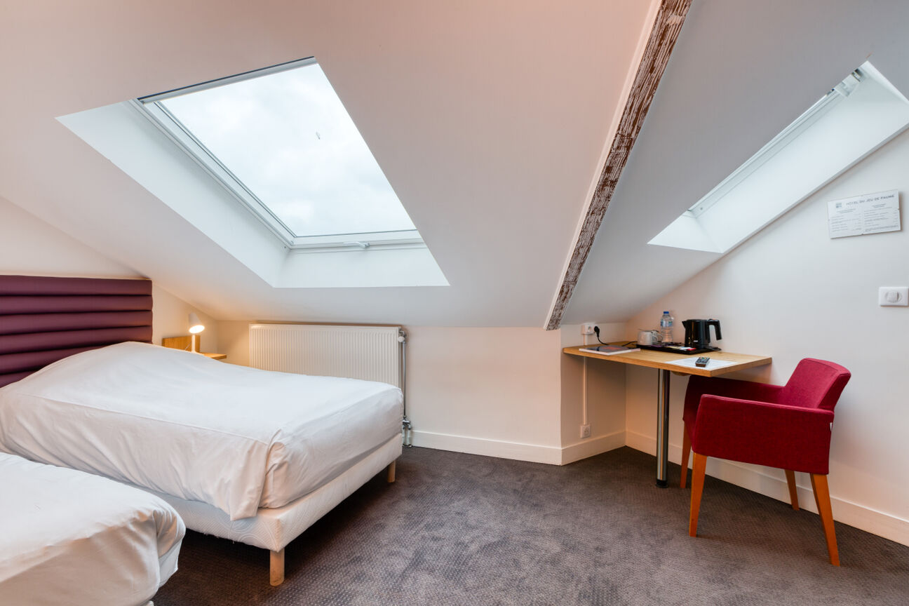 Avec ses deux lits simples, la chambre twin est pensée pour partager sans se gêner. Idéale pour des amis, des collègues ou un séjour professionnel à Versailles, elle combine indépendance, calme et confort, dans l’esprit discret du Jeu de Paume.